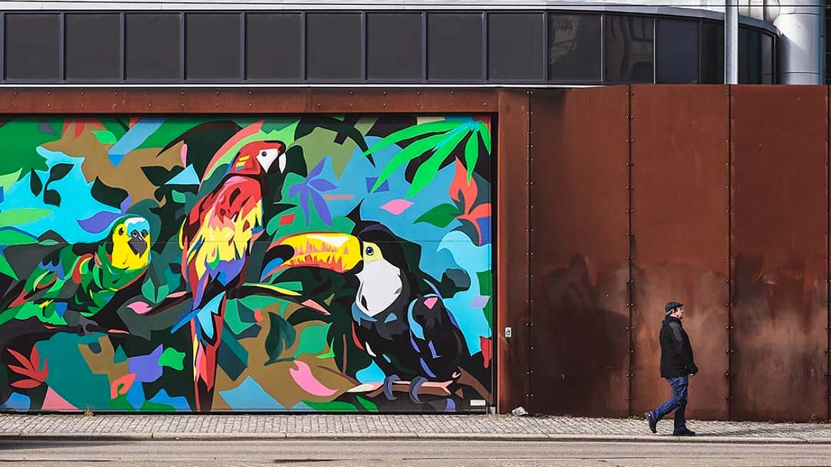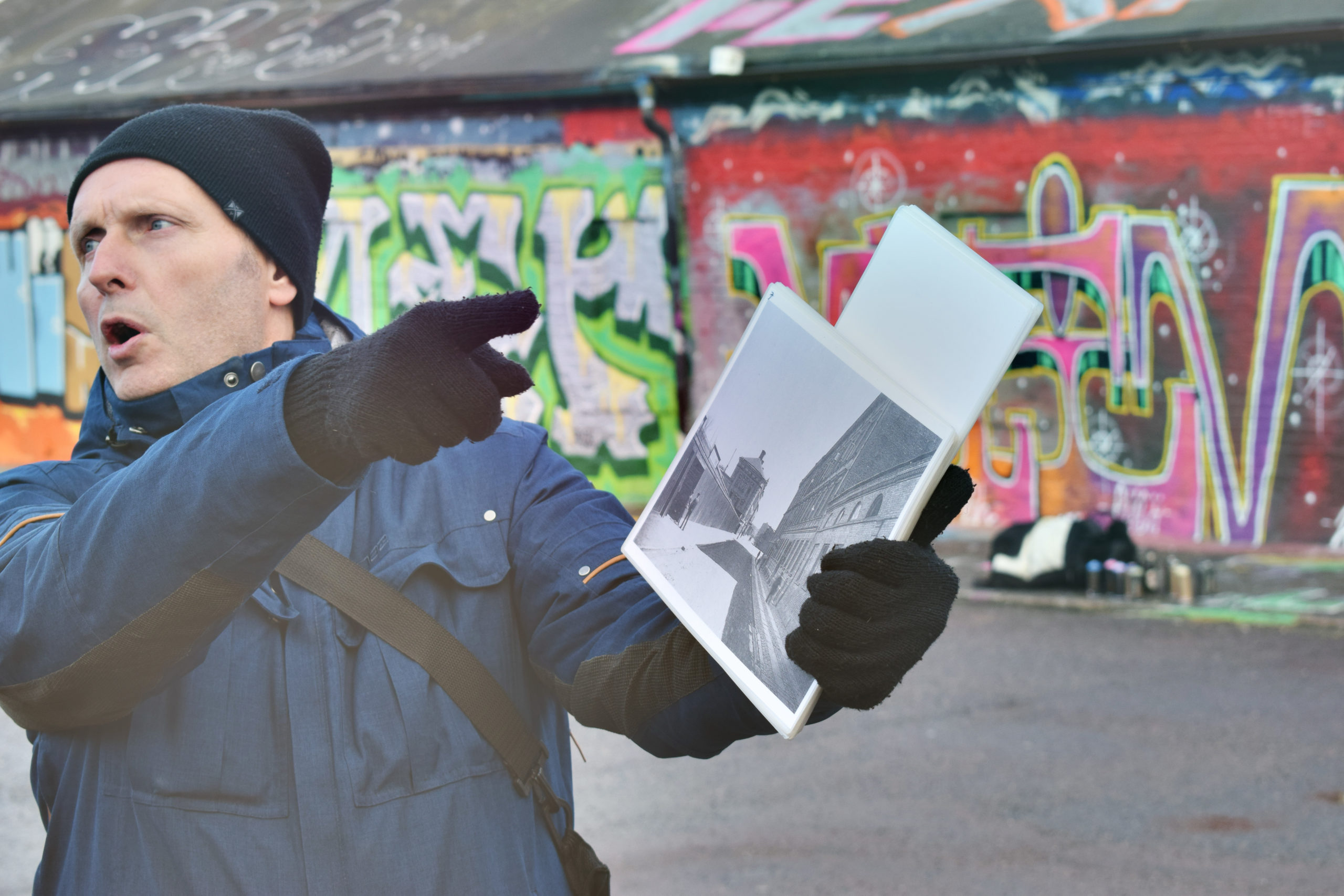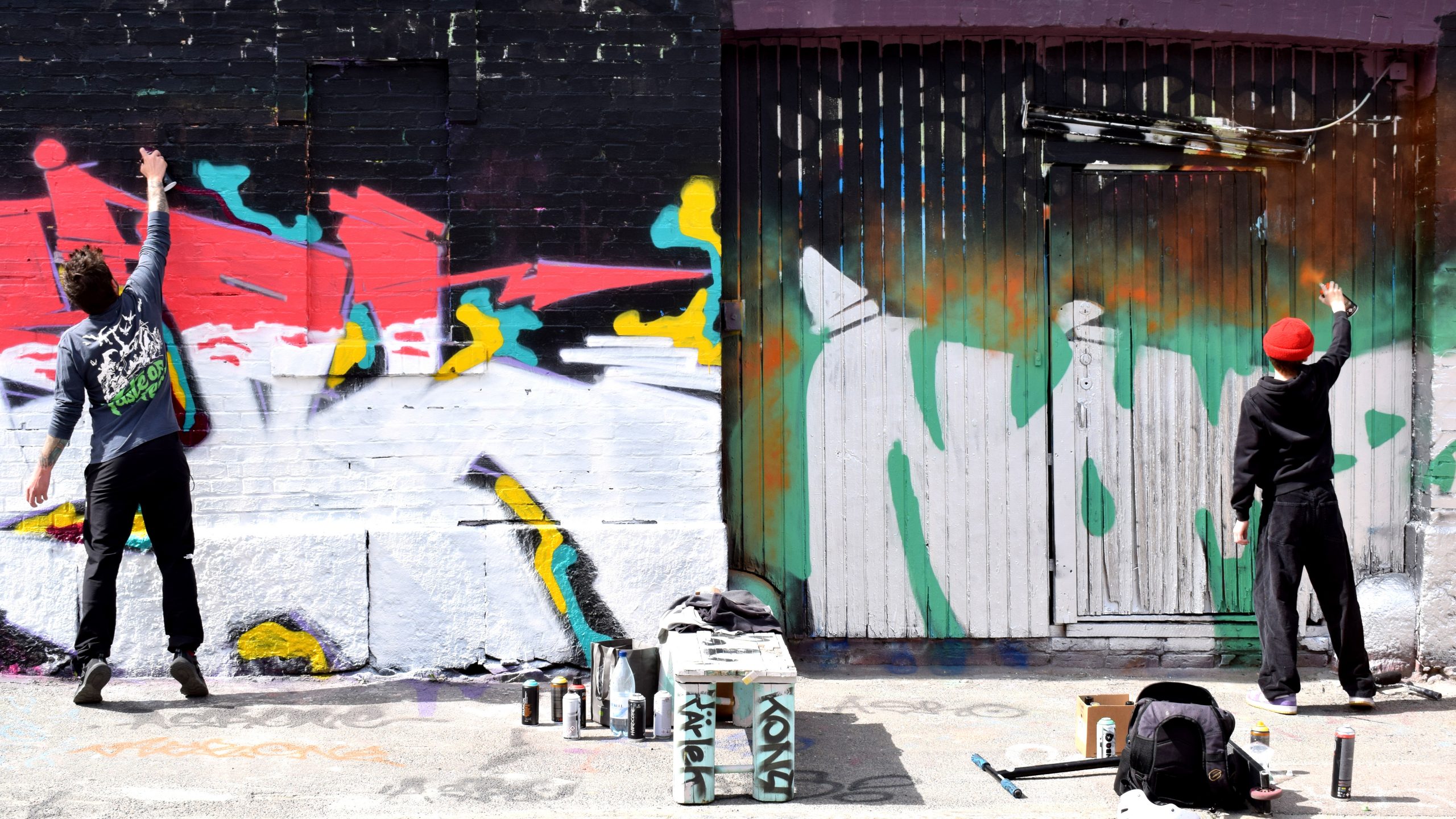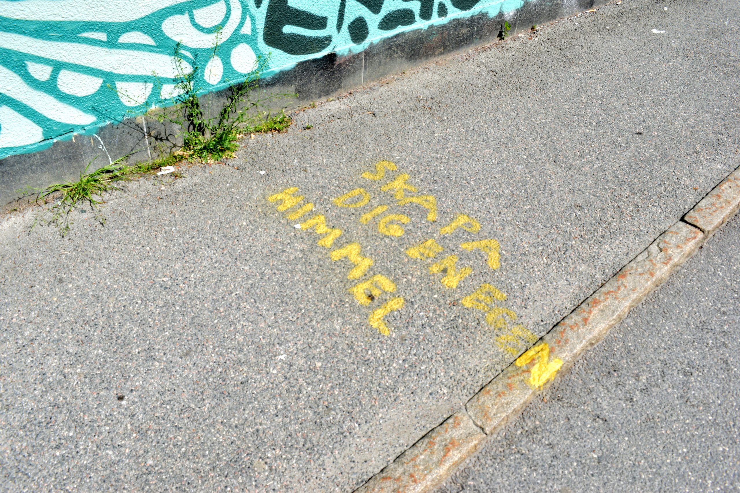 Ungdomar står i en stadsmiljö. På en vägg syns gatukonst.