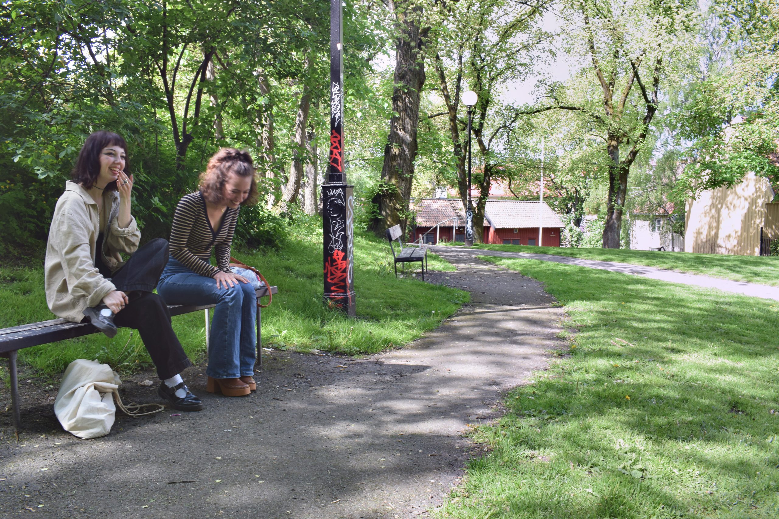 Människor sitter i en park. Längre bort ryker det, någon grillar, och i bakgrunden syns lummiga träd och ett bostadshus.